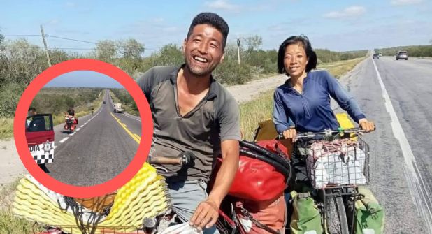 En dos bicicletas, un aventurero matrimonio japonés se encuentra recorriendo Tamaulipas; es su segundo viaje internacional y ahora su deseo es llegar pedaleando hasta la Patagonia Argentina.