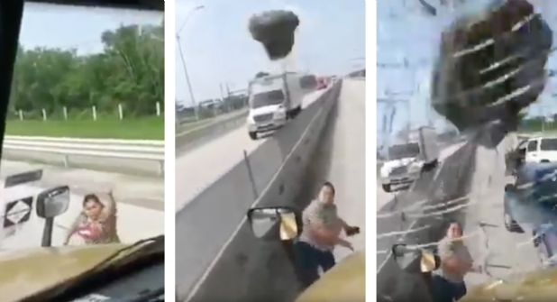 Afortunadamente la roca no logró atravesar el parabrisas pero sí estrelló el cristal ante el desconcierto del conductor de la unidad de carga pesada.