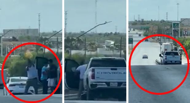 Una persona grabó el momento exacto a la altura del parque Prologis, en la colonia Industrial de Reynosa, en el que dos sujetos que portaban armas largas detuvieron al conductor de una camioneta en la Carretera Reynosa-Río Bravo, al cual bajaron con violencia de una camioneta Chevrolet blanca de doble cabina.