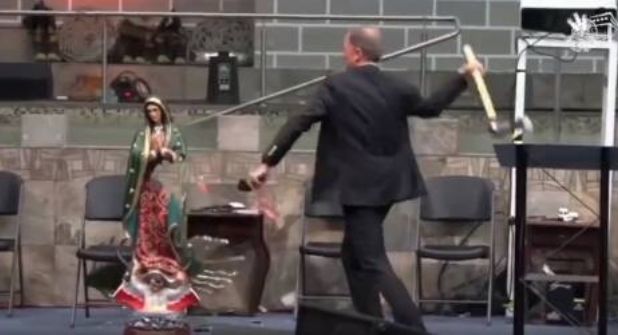 El video, grabado por el equipo del propio pastor en un evento para celebrar el inicio del año, muestran el justo momento en el que el predicador pone frente a todos una imagen de la Virgen de Guadalupe para, acto seguido, golpearla y destrozarla con un hacha.