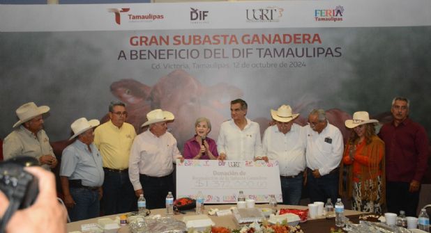 Los ganaderos de Tamaulipas entregaron al gobernador Américo Villarreal Anaya y a la presidenta del DIF Estatal, doctora María de Villarreal, un donativo de 1,372,000 pesos en beneficio de los programas de esta noble institución. El donativo es el resultado de la gran subasta ganadera realizada este sábado, en el marco de la Feria Tamaulipas 2024.