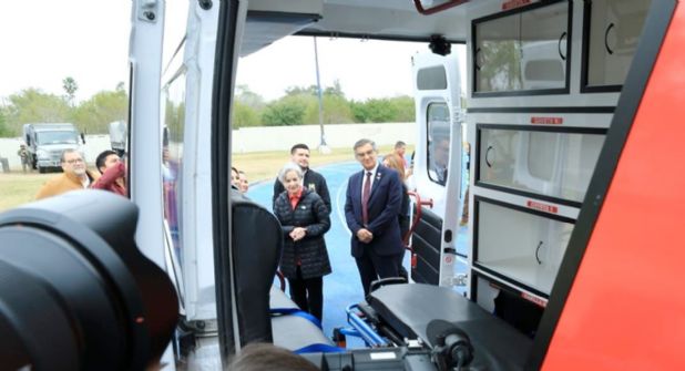 Matamoros, Tamaulipas.-El gobernador Américo Villarreal Anaya visitó el Centro de Atención para Repatriados y, junto con la presidenta del DIF Estatal, doctora María de Villarreal, entregó una ambulancia que estará disponible para atender a la población migrante.