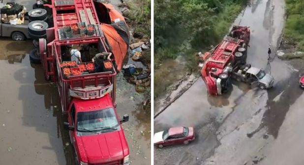 Reportes de las autoridades señalan que el operador del camión no pudo distinguir el hoyo cubierto por una capa de agua y cayó en él, perdiendo el control y terminando volcado sobre su costado. Afortunadamente, no se reportaron lesiones graves.