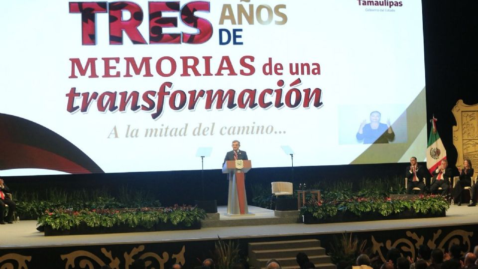 El gobernador de Tamaulipas, Américo Villarreal Anaya, acompañado de la doctora María de Villarreal, presidenta del Sistema DIF Tamaulipas, arribó al Teatro Amalia González Caballero de Castillo Ledón, de esta ciudad capital, para dar su mensaje al cumplirse tres años de la transformación.