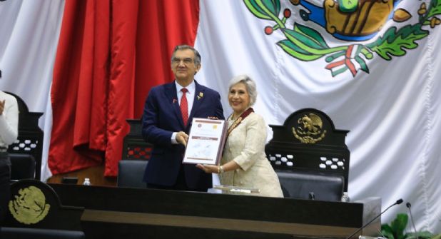 El gobernador Américo Villarreal Anaya entregó la Medalla al Mérito "Luis García de Arellano" a la maestra tampiqueña Cecilia Imelda Lugo Cruz y develó su nombre con letras doradas en el Muro de Honor del Congreso del Estado.