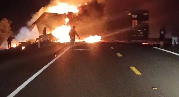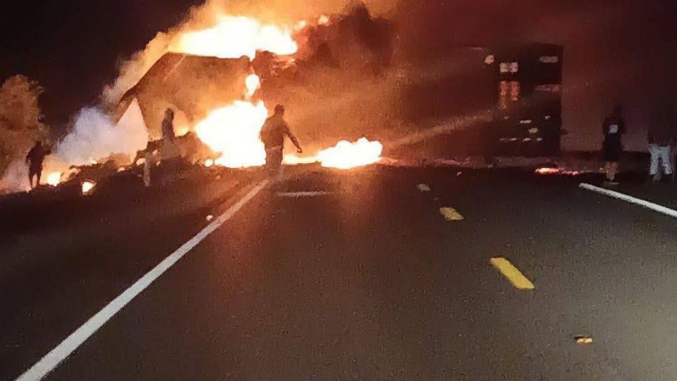 El accidente provocó que las dos pesadas unidades se incendiaran; presuntamente los operadores no alcanzaron a salir y murieron calcinados adentro de los vehículos.