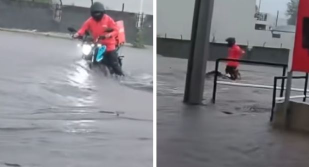 "¡Tranquilo, tranquilo!", se escuchan los gritos de una mujer al motociclista, quien está varado en medio de una avenida, luchando por mantenerse de pie en medio de una fuerte corriente de agua.
