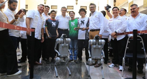 Al término de la ceremonia de honores, el gobernador recibió al grupo de estudiantes de la carrera de Ingeniería en Mecatrónica de la Universidad Politécnica de Victoria, que forman parte del taller-comunidad NIX-Lab y que recientemente tuvieron una destacada participación en un concurso internacional celebrado en Brasil, quienes le presentaron una exhibición de dos robots Unitree Go2 operados a distancia.