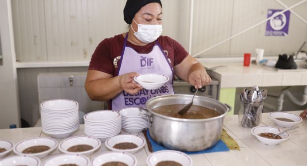 La funcionaria subrayó la participación activa de madres y padres de familia, quienes integran los Comités de Desayunos Escolares y colaboran diariamente en la preparación de los alimentos.