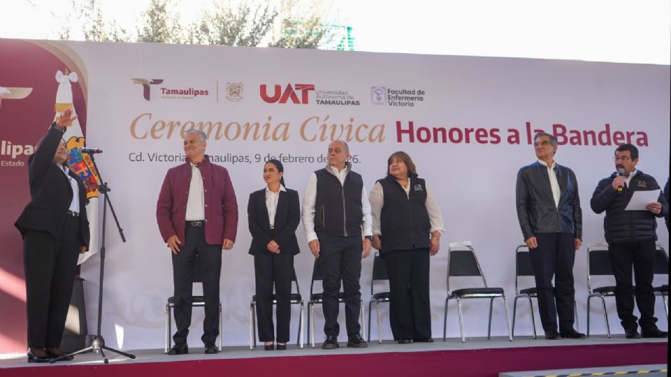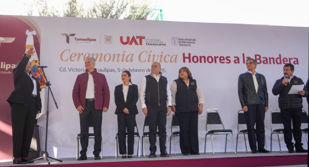 El gobernador Américo Villarreal Anaya, junto con el rector de la Universidad Autónoma de Tamaulipas (UAT), Dámaso Anaya Alvarado, encabezó este lunes la ceremonia de honores a la bandera y atestiguó la toma de protesta de la Dra. María Guadalupe Vázquez Salazar como directora de la Facultad de Enfermería Victoria para el periodo 2026-2029.