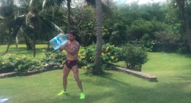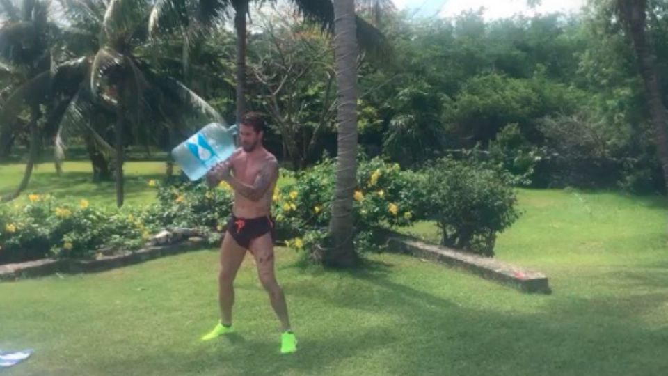 El vídeo, que ha publico él mismo en su cuenta de Instagram, muestra como el defensa utiliza un garrafón lleno de agua a modo de pesa.