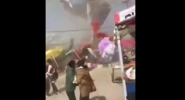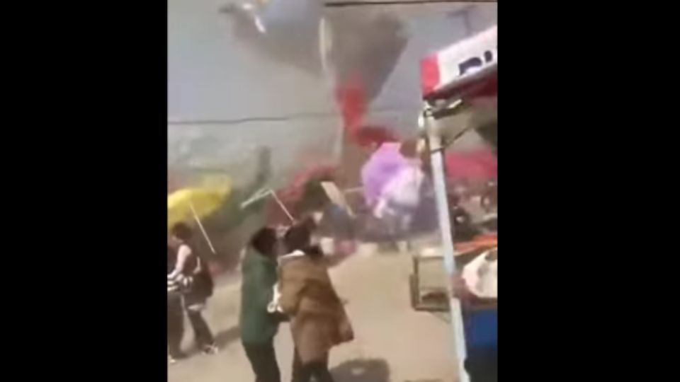Un testigo filmó este domingo el momento en que un tornado arribó sorpresivamente a un parque de la ciudad china de Zhengzhou haciendo volar por los aires un castillo inflable con varios niños dentro.