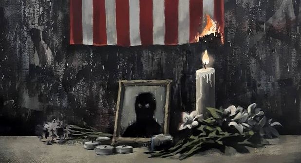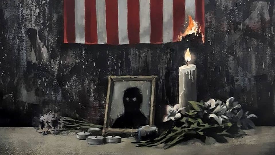 La poderosa pieza artística de Banksy fue publicada en redes sociales. La obra muestra la bandera de los Estados Unidos, una vela y un retrato en negro bastante significativo. Como se dijo, poderosa.