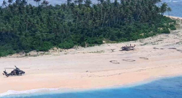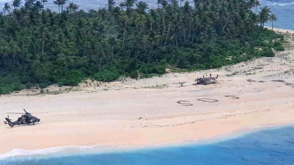 Los hombres desaparecieron en el archipiélago de Micronesia, al este de Filipinas, y se les ocurrió marcar la señal de "SOS" en la arena, la que fue detectada por los rescatistas en aviones australianos y estadunidenses, informó el departamento de defensa australiano.