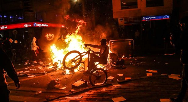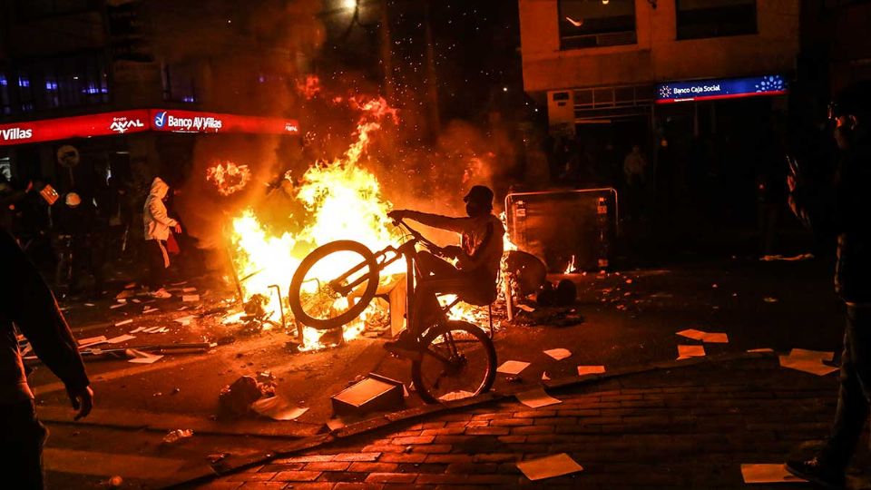 Las manifestaciones y disturbios estallaron la noche del miércoles en varios puntos de la capital colombiana y se extendieron a ciudades como Medellín y Cali.