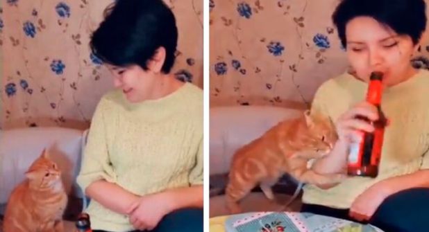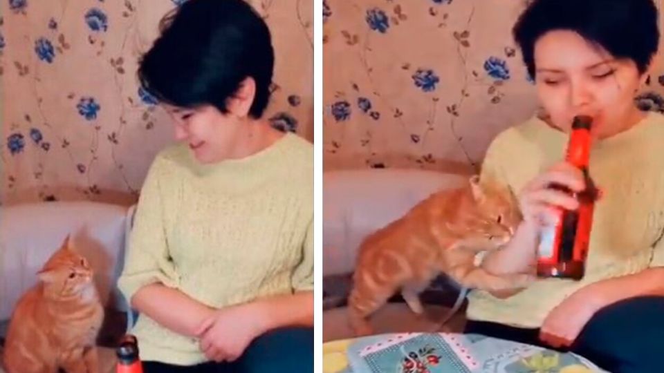 Las imágenes mostraron el gracioso momento en que la mascota estaba sentada junto a su dueña y, cada que la mujer levanta la botella de cerveza, la gatita maullaba y le mordía el brazo para evitar que ingiera la bebida.