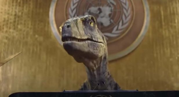 Dinosaurio invade la ONU para advertir sobre los desastres climáticos.