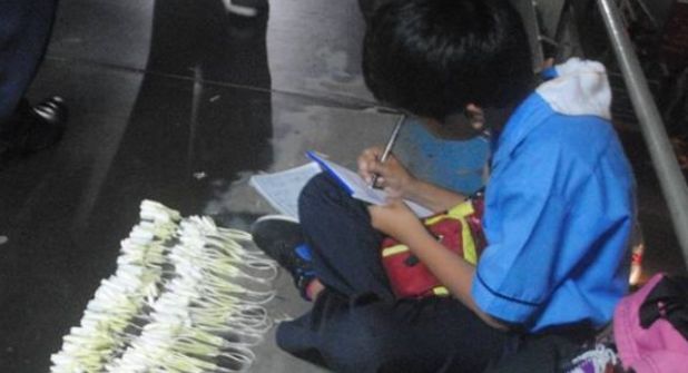 Sin duda las ganas de superación de este niño vendedor de flores en Filipinas, se verán reflejadas en algún momento del futuro. Quien sabe, a lo mejor podrá ser un buen actuario al servicio público.