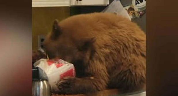 El hombre que encontró en su casa a un oso devorando una cubeta de KFC grabó el increíble encuentro.