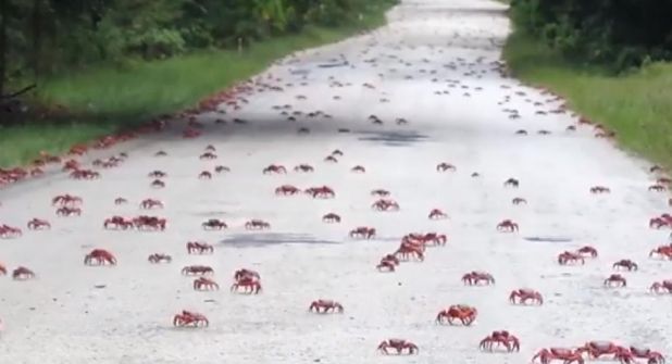 Los cangrejos rojos de la isla de Navidad fueron captados en video emergiendo de las zonas boscosas como si se tratara de una marea roja, la cual se ha convertido en todo un espectáculo para los turistas.