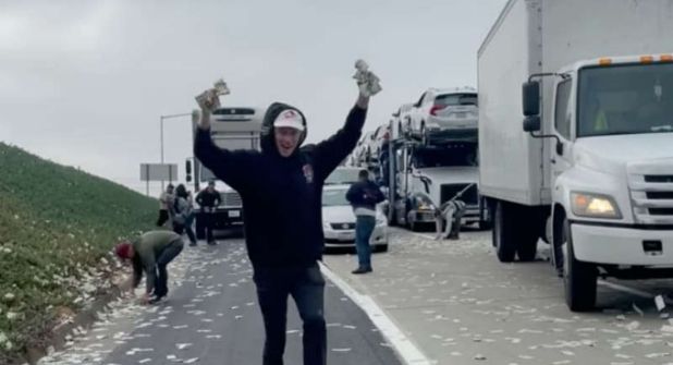 Bolsas de dinero cayeron de un camión blindado lo que ocasionó una lluvia de dólares en una carretera de California.