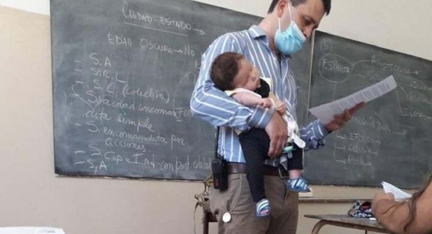 Maestro carga bebé de alumna para que tome su clase sin problemas, foto se vuelve viral en redes.