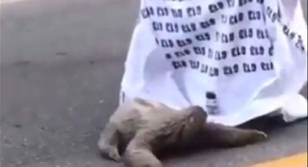 En redes sociales el video de un hombre que ayuda a un perezoso a cruzar una carretera se ha hecho viral, pues el animalito hace un gesto de agradecimiento.