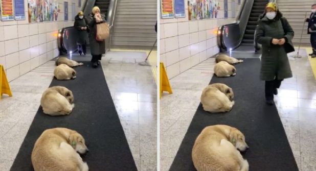 En las imágenes se puede ver que un grupo de perros durmiendo sobre la alfombra de una estación del metro en la ciudad de Üsküdar, Estambul, mientras que otro de color negro descansa en las escaleras sin perturbarse por el paso de los usuarios que tampoco los molestan.
