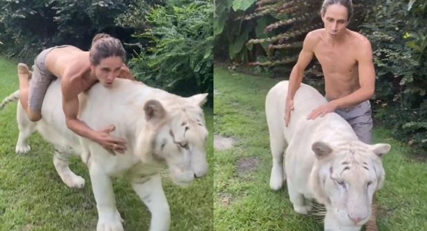 El video del hombre que arriesga su vida al montar un tigre blanco para generar contenido en su TikTok ha generado comentarios divididos.