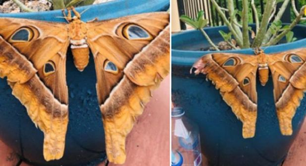 Fue en la ciudad de Cairns, Queensland, donde una mujer fotografío una enorme polilla hércules que reposaba sobre una maceta en su balcón.