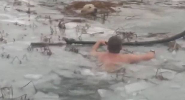 Cuando las autoridades arribaron al lugar para salvar al perro, debieron despojarse de sus prendas para ingresar al agua que se encontraba a temperatura de congelación. En el video se observa el momento en el que los guardias ayudan al animal con una rama de árbol.