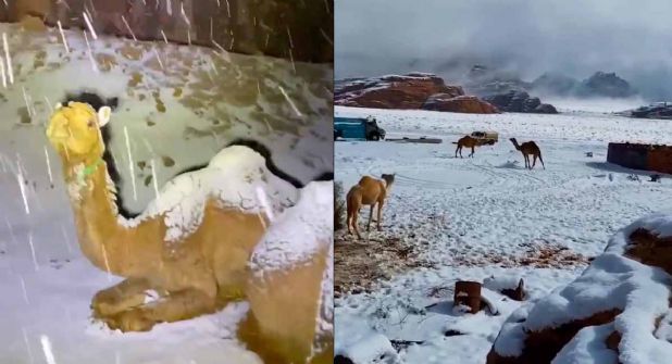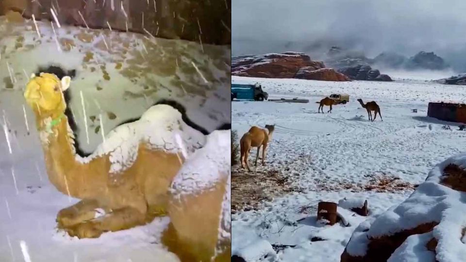 A través de redes sociales, los locales compartieron imágenes de la nevada, entre ellos, un video de tres camellos en la zona montañosa que rodea Tabuk.