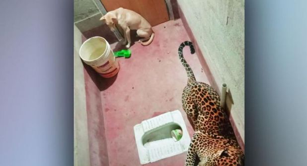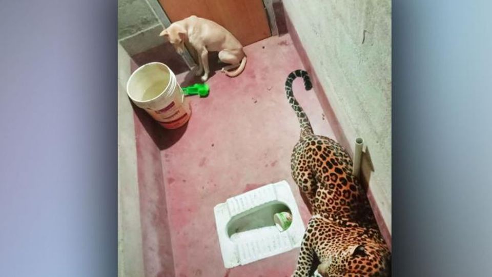This photo was taken from outside through a gap in the window. It is a leopard and a dog stuck together since this morning inside the toilet of a house in Kadaba, Dakshina Kannada district. I am told the leopard escaped at 2 pm and the dog is alive! pic.twitter.com/hgjJhaXW03