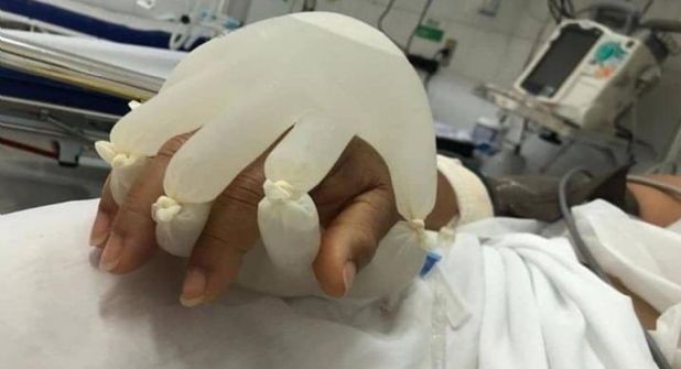 Las enfermeras de San Carlos, una pequeña ciudad en Sao Paulo, explicaron que la Mano de Amor se fabrica con guantes de látex que se llenan con agua tibia de las regaderas del hospital, luego son amarrados y se colocan entrelazados entre las manos de los pacientes que se encuentran intubados.