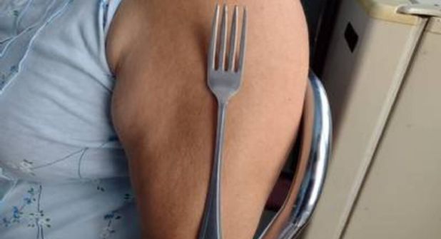 Al reproducir un video se ve cómo un tenedor se queda sostenido en el área de la vacuna, ya sea una moneda o una cuchara, las fotos muestran lo mismos.