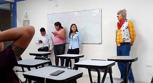 El joven es estudiante de la Universidad de San Pedro de Huacho, en Perú, y él mismo compartió ;as fotografías con su disfraz en su salón de clases.