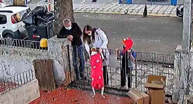Una mujer rubia localizó el lugar donde vive el can y llegó a la casa para regalarle un suéter para reemplazar el que le habían robado y nuevamente, el hecho quedó captado por las cámaras.