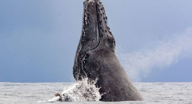 Un susto para morirse se llevó la mujer cuando vio salir del agua a una ballena.