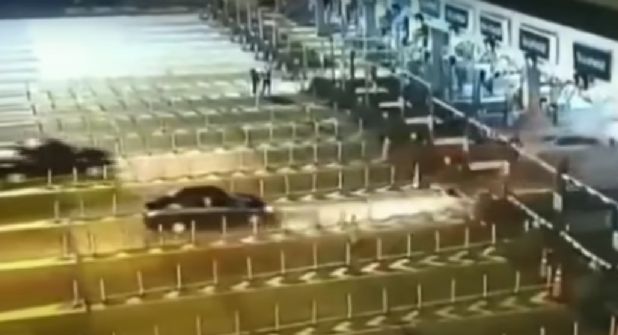 El conductor del Fiat Cronos, que iba a exceso de velocidad, impactó contra otro automóvil que se encontraba haciendo fila. Este bólido salió volando, destrozando la cabina de cobro y quedando volcado sobre el asfalto.