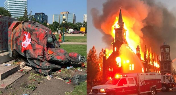 Anteriormente un par de iglesias fueron destruidas y dos más quemas. El día miércoles dos iglesias fueron quemadas, mientras se le exigía al Papa a pedir perdón por los abusos cometidos en los internados donde se encontraron tumbas de niños sin nombre.