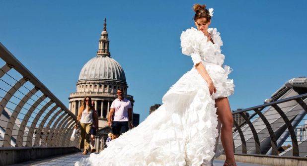 La modelo Jemima Hambro lució el vestido de novia elaborado con mil 500 cubrebocas en las calles de Londres, el Puente del Milenio y la Catedral de San Pablo.
