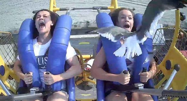 El video fue grabado una cámara escondida dentro del juego mecánico, captó el momento exacto en el que el ave choca contra la cara de una joven en las alturas.