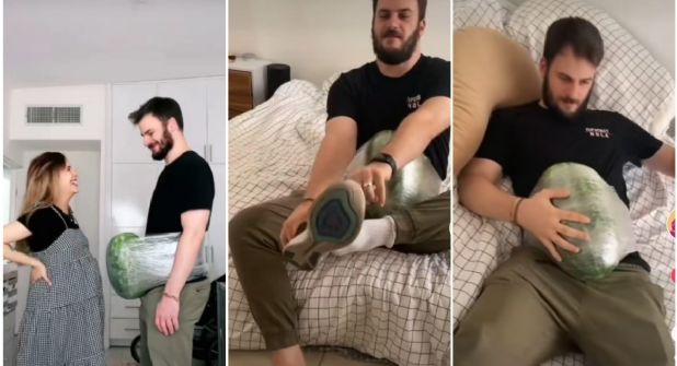 Un hombre se volvió viral al pegarse una sandía en el estómago para fingir estar embarazado, y así experimentar por unos momentos un poco de lo que siente su esposa embarazada.