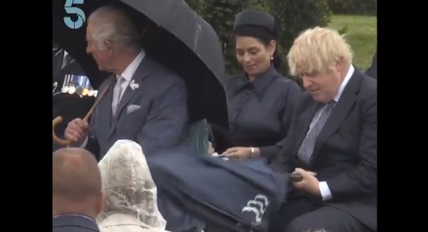 El evento se realizó a cielo abierto, con un ligero clima lluvioso. El mandatario procedió a abrir su paraguas, sin embargo, no pudo abrirlo discreta y correctamente, incluso se le volteó al revés. La lucha de Boris Johnson y su paraguas quedó grabada en un video, que se hizo viral en las redes sociales posteriormente.