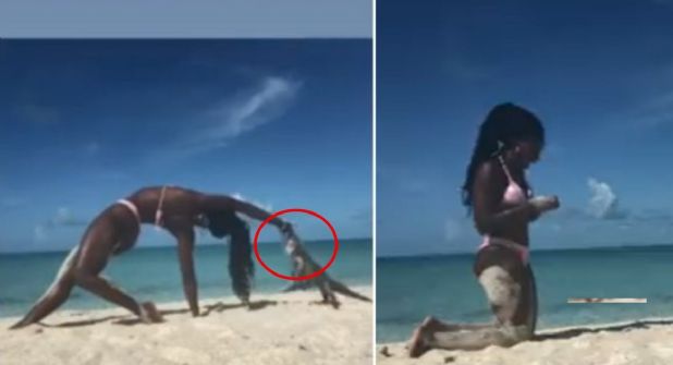 La mujer que vestía un traje de baño color blanco, estaba en una posición similar a un arco, donde su cuerpo estaba curvado hacia atrás, cuando se le acerca la iguana y la atacó con tremenda mordida, mientras que la mujer mientras hacía yoga dio tremendo grito.
