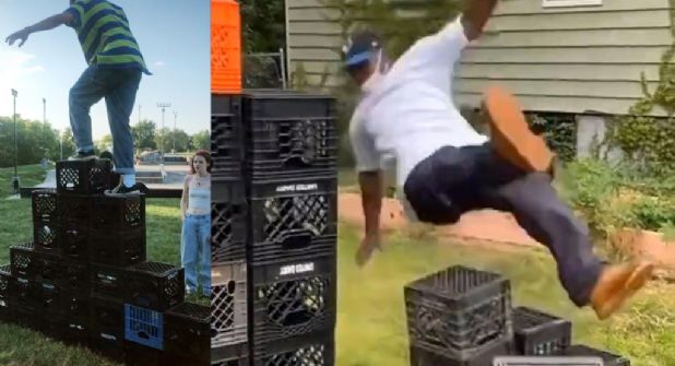 Expertos en salud advirtieron que seguidores de redes sociales no deberían intentar el nuevo desafío de TikTok: caminar sobre una pirámide de cajas de leche que no están firmes, el desafío #milkcratechallenge