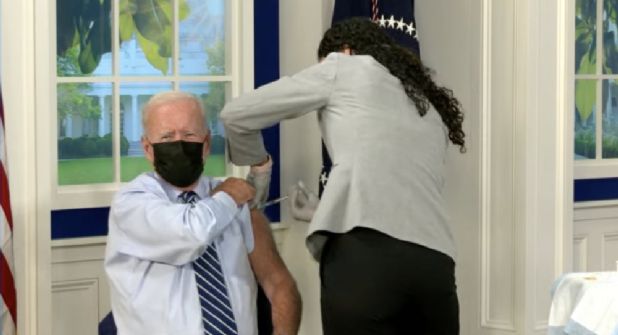 “Aunque no lo parezco, tengo más de 65 años y es por eso es que voy a recibir el refuerzo hoy”, bromeó Biden ante reporteros antes de recibir la inyección
