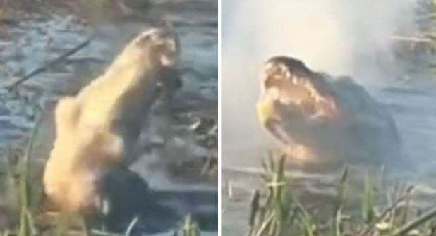 Justo cuando el aparato se acerca más, George reacciones, salta y tira una mordida para atrapar al dron con su hocico y posteriormente comienza a masticarlo como si se tratar de una de sus presas.