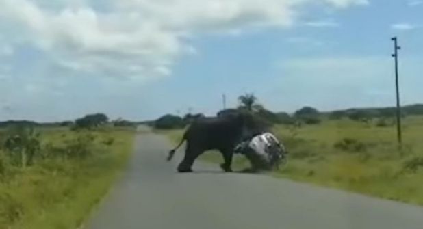 En Sudáfrica un elefante volcó un automóvil con familia (una pareja y sus dos hijos) todo quedó grabado en video.