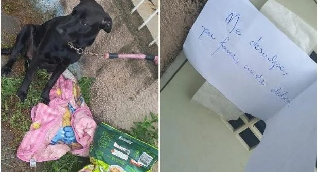 En redes sociales se volvió viral la historia de abandono de una perrita en Brasil, la cual fue atada a una reja e incluso la dejaron con comida, su cobija y una nota.